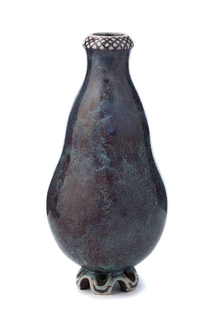 VASE PIRIFORME En grès émaillé bleu jaspé rouge, reposant sur une base festonnée ajourée d'inspiration asiatique, col souligné d'un motif quadrillé