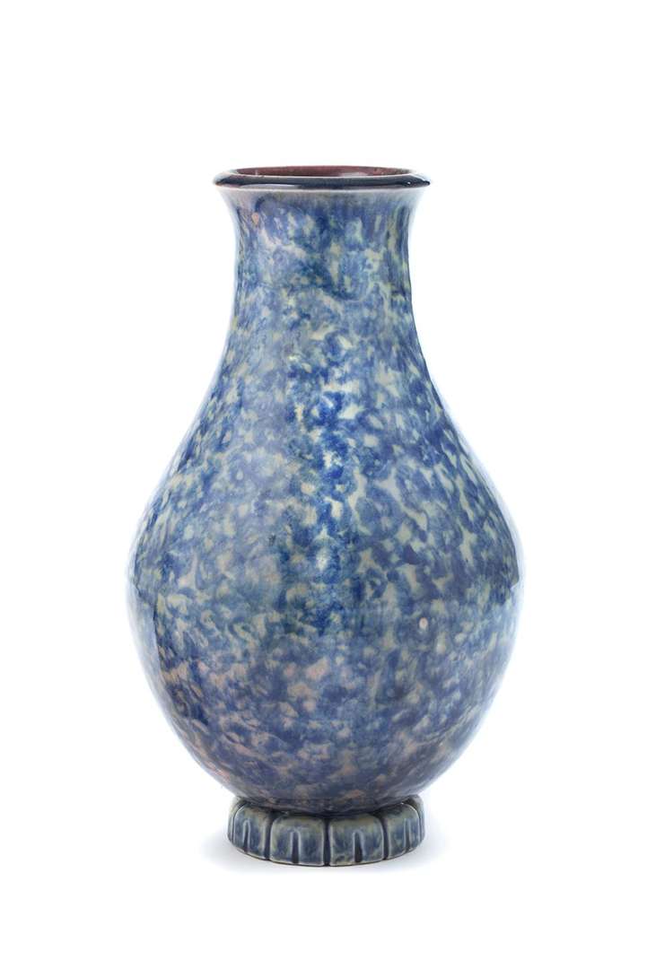 GRAND VASE BALUSTRE En grès émaillé, reposant sur une base festonnée d'inspiration asiatique, émaux bleux et blancs, col ourlé d'un jonc bleu foncé, intérieur émaillé rouge nuancé de bleu. Signature d'un cachet en creux «Kiefer» et porte le numéro de modèle 753 au revers de la base