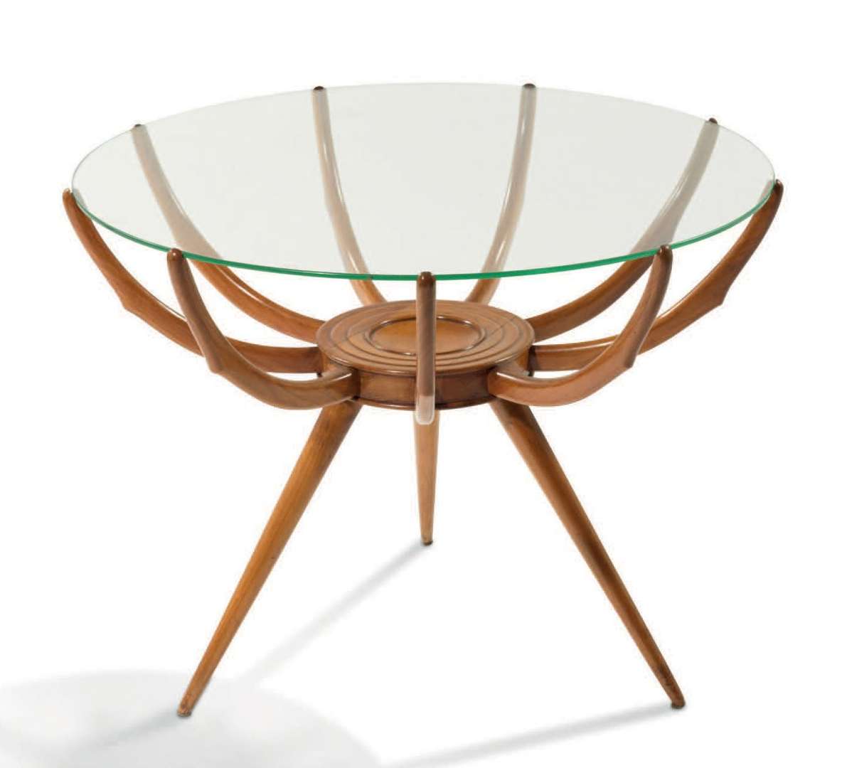 TABLE BASSE MODÈLE «RAGNO» Structure en frêne reposant sur trois pieds effilés et un ensemble de bras arqués formant corbeille sous le plateau circulaire en verre.