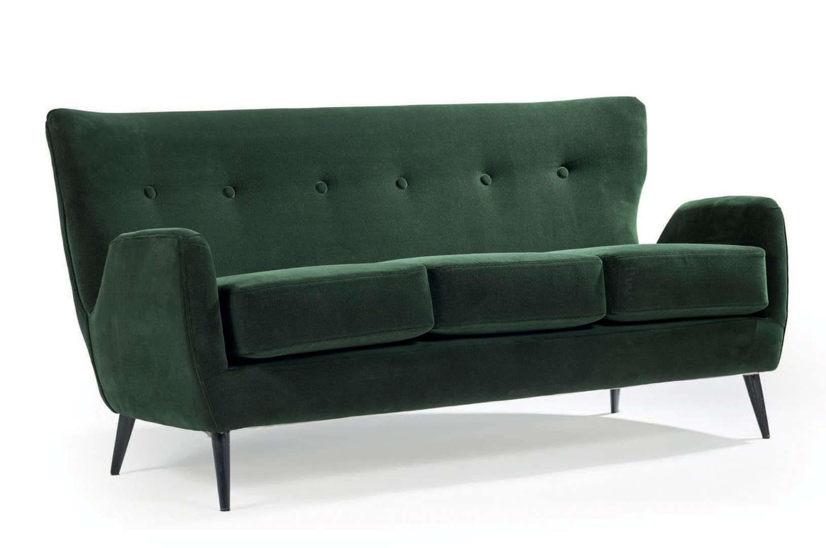 CANAPÉ TROIS PLACES Structure en bois garnie de mousse tendue de velours vert sapin| reposant sur des pieds cylindriques en bois laqué noir. Dessiné pour l'atelier