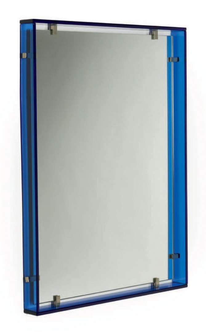 MIROIR RECTANGULAIRE À encadrement façon caisse américaine en épaisses lames de verre bleu foncé. Eléments de fixation en métal chromé.