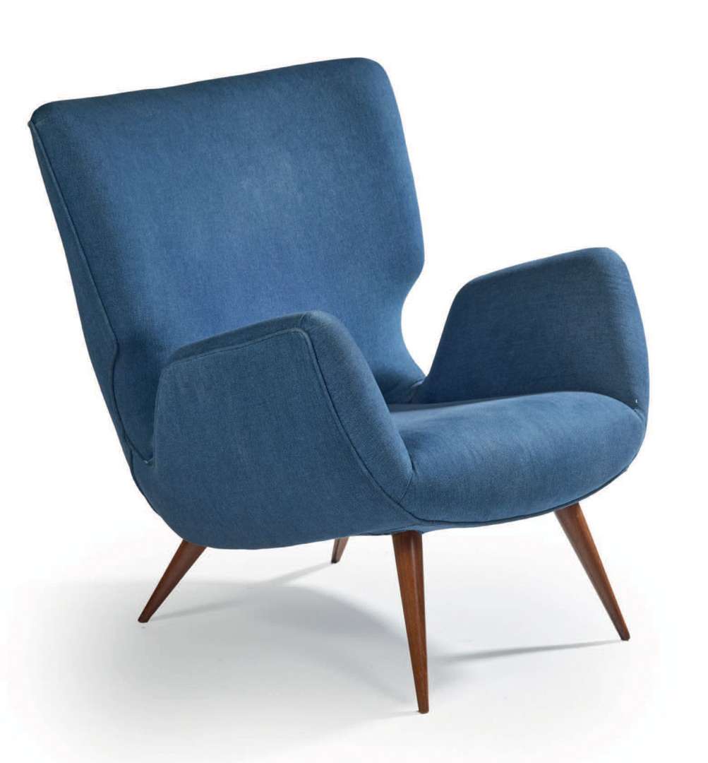 FAUTEUIL À LARGE DOSSIER DÉCOUPÉ assise légèrement inclinée se prolongeant en accotoirs sur les côtés et reposant sur des pieds effilés.
