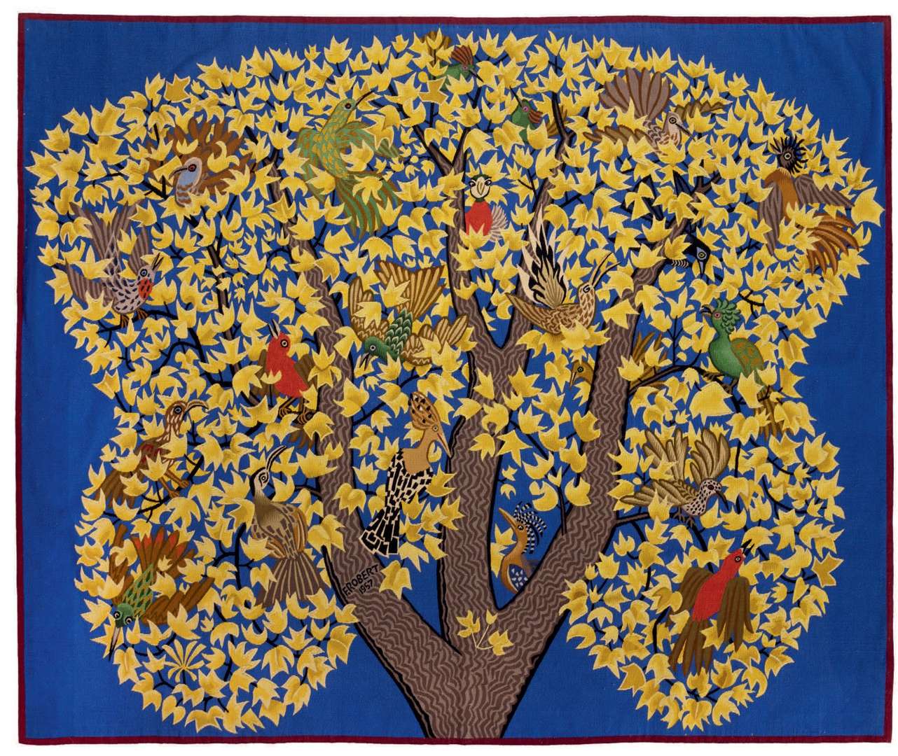 Tapisserie d'Aubusson en laines polychromes à décor d'un arbre habité d'oiseaux exotiques se détachant sur fond bleu.