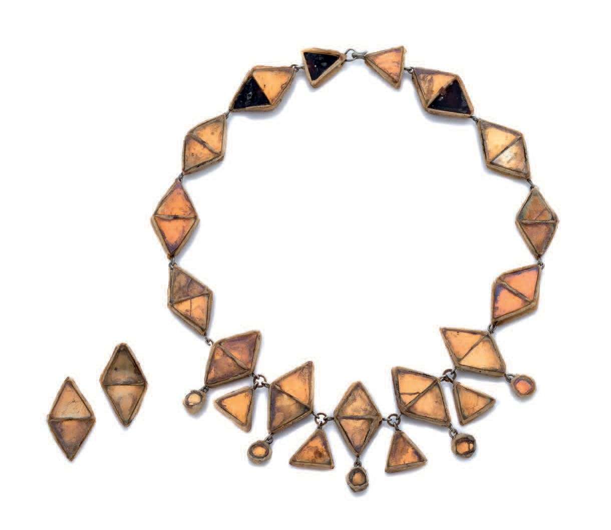 Un collier et une paire de boucles d'oreilles, en talosel beige incrusté de miroirs jaune-orangé, perles en forme de losanges, pampilles triangulaires et circulaires. Circa 1955.
