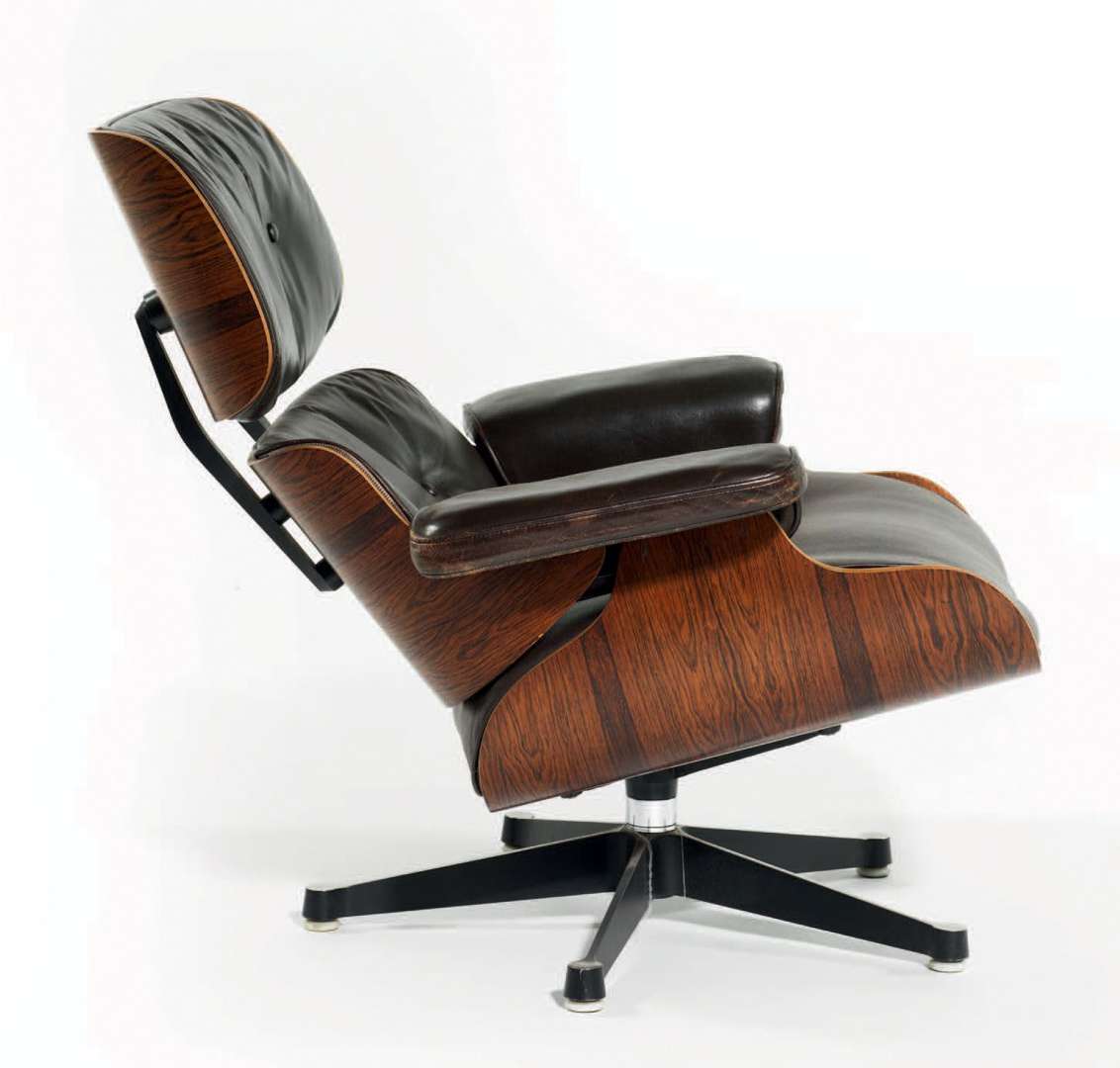 DIT «LOUNGE CHAIR» Coque en bois thermoformé moulé plaqué de palissandre, garnie de coussins gainés de cuir brun foncé, reposant sur un piètement en métal laqué noir.