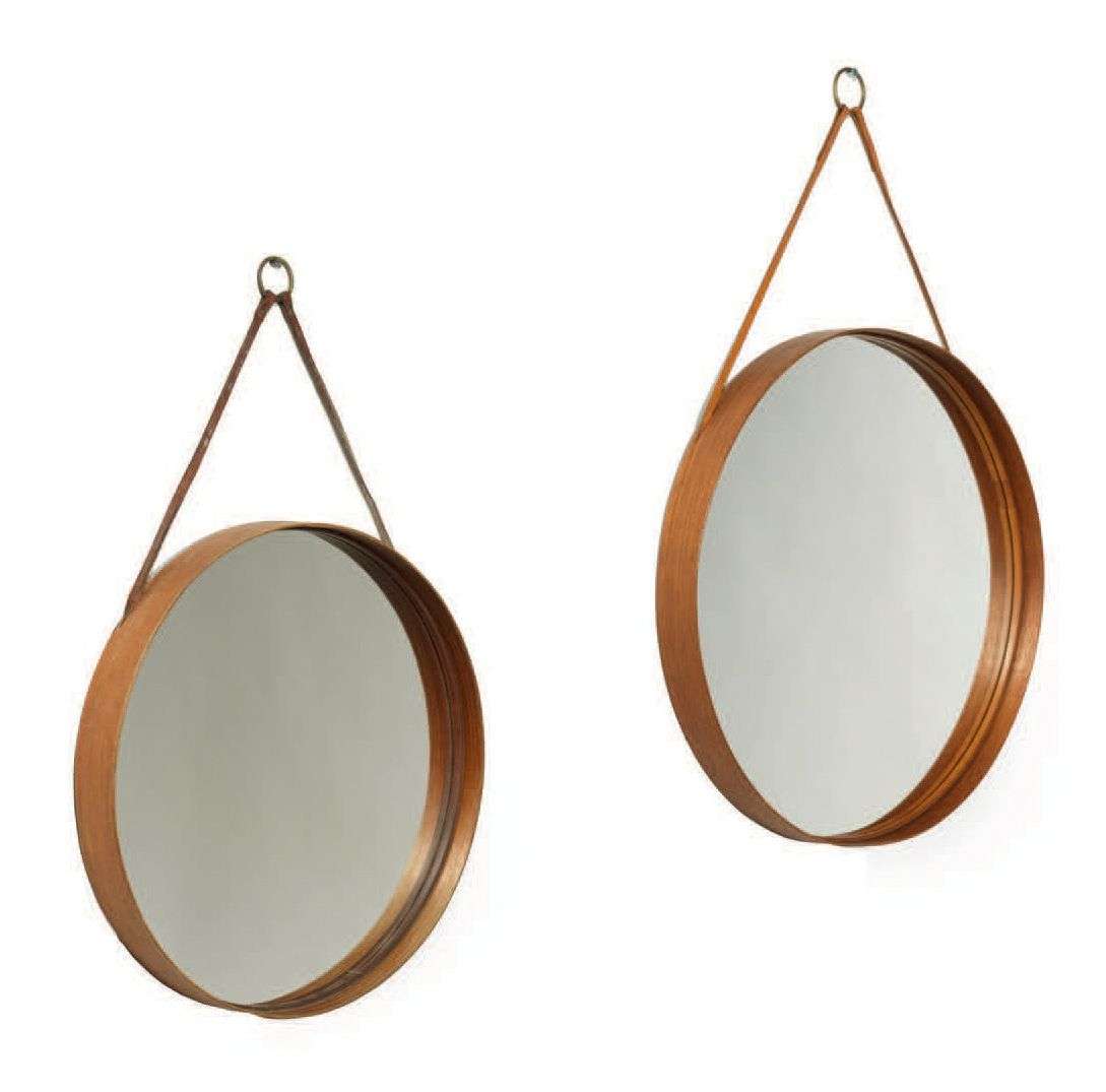 DEUX MIROIRS CIRCULAIRES En lame de pin teinté, intérieur souligné de bandeaux de cuir, fixation par un anneau en laiton relié à deux liens en cuir (très usés).