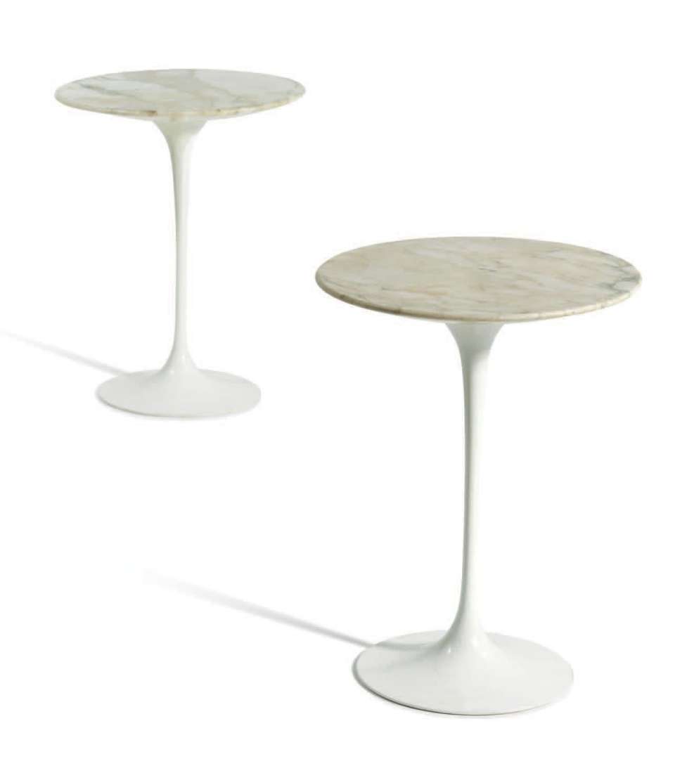 GUÉRIDON Plateau circulaire en marbre blanc veiné de gris reposant sur un pied tulipe en fonte d'aluminium laquée blanche. Estampille Knoll International au revers du piétement.