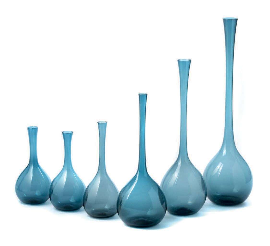 ENSEMBLE DE SIX VASES En verre soufflé bleu, à corps bulbaire et long col effilé.