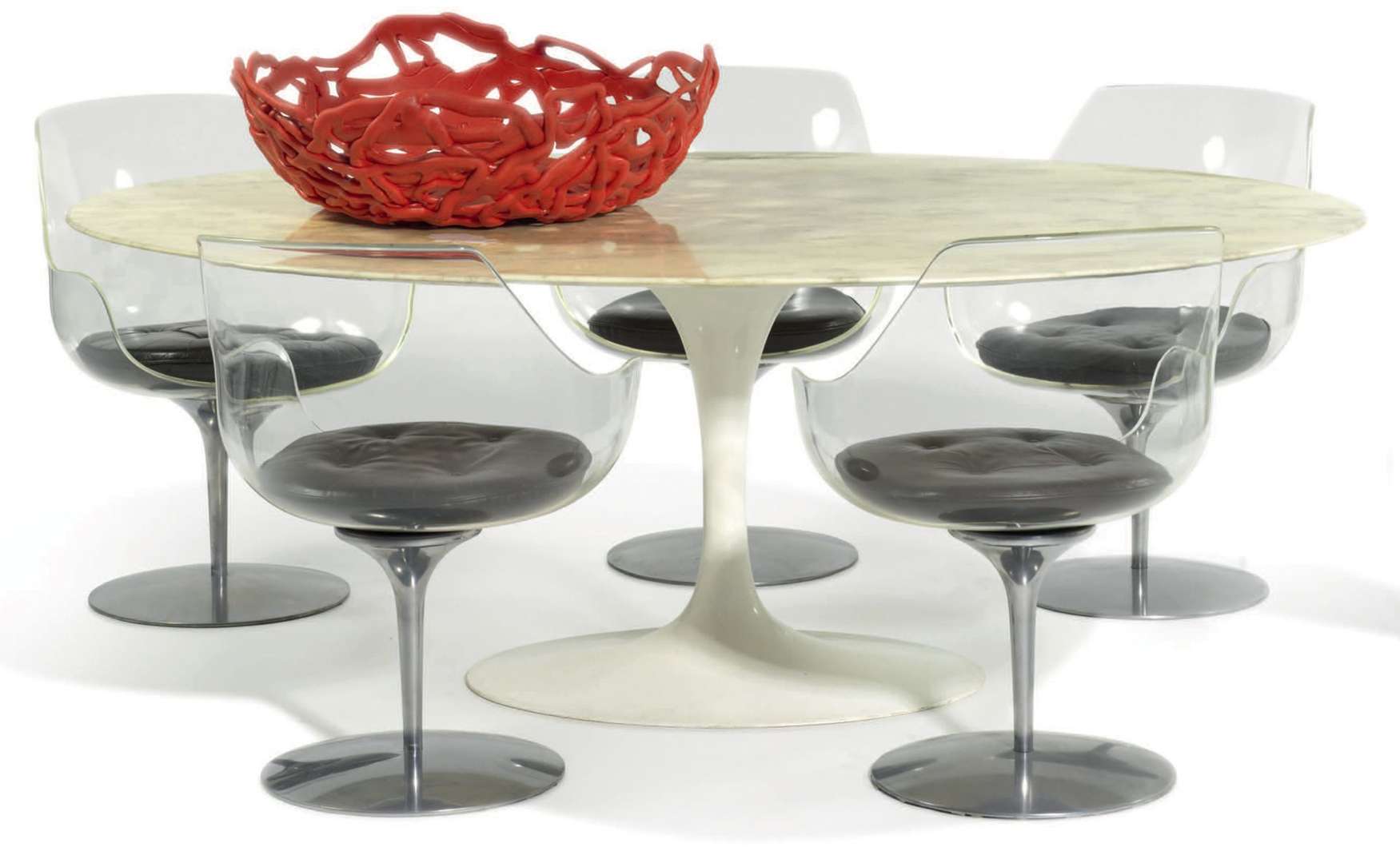 Assise en plexiglas translucide garnie d'un coussin de cuir brun| reposant sur un pied central à réception de base circulaire.