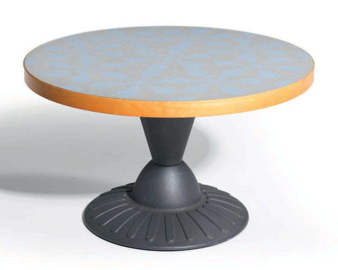 GUÉRIDON À PLATEAU CIRCULAIRE Plaqué de mélaminé à décor de fleurs stylisées bleu pâle, reposant sur un pied central en fonte d'aluminium.