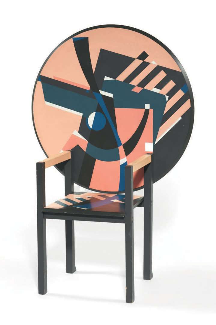 FAUTEUIL-TABLE Bois laqué gris anthracite côté table | plateau pivotant formant dossier du fauteuil, laqué rose, bleu, gris et noir, avec motifs abstraits côté fauteuil.