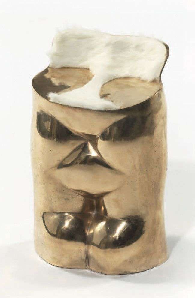 TABOURET-SCULPTURE MODÈLE «FAUSTO» de la Collection «Ultramobile» en bronze poli et peau de mouton.