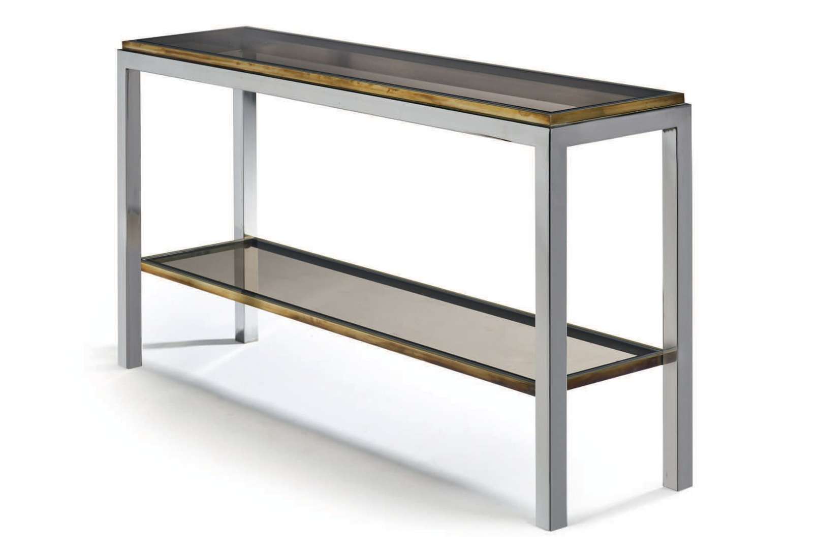 Structure en acier inoxydable et laiton poli, à deux plateaux rectangulaires en verre fumé.