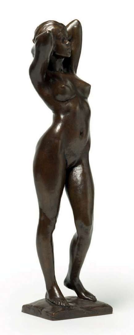 Sculpture en bronze à patine brune représentant une jeune femme dénudée à la posture langoureuse.