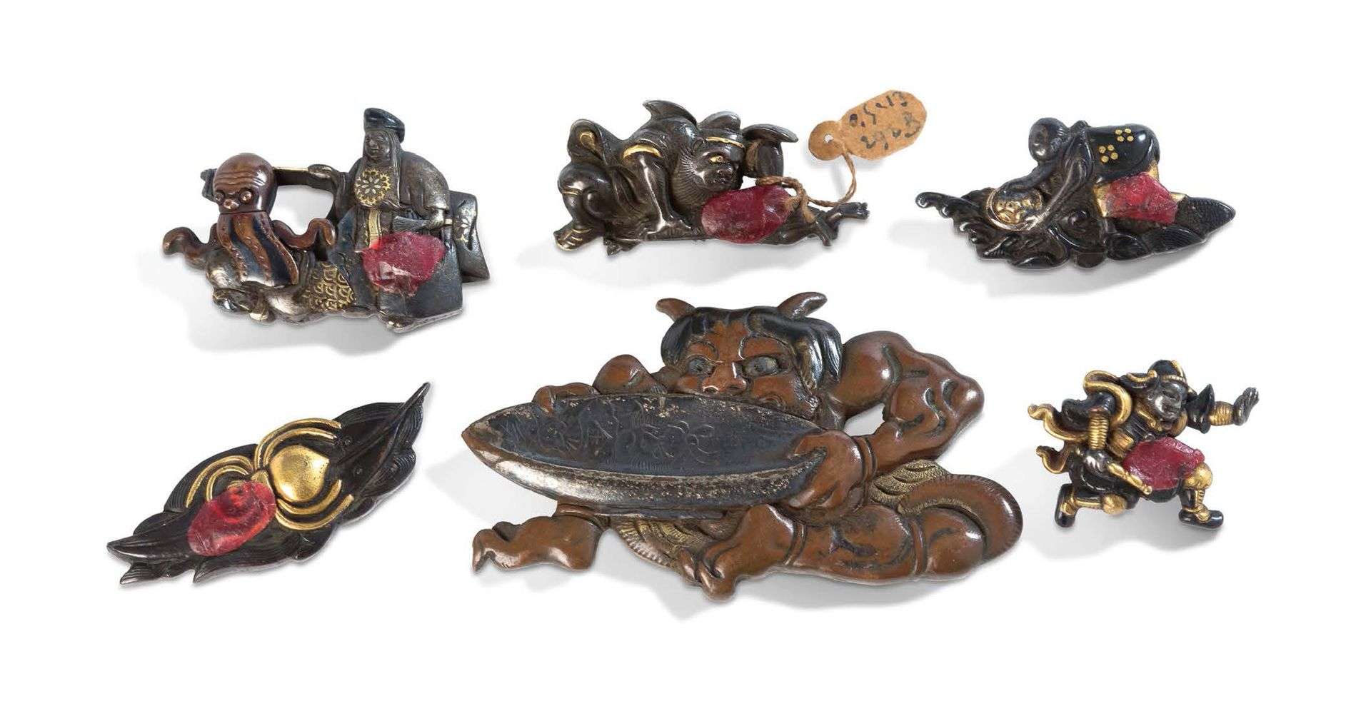 Lot de six objets comprenant des menuki dépareillés et des fermoirs de blagues-à-tabac en shibuichi à décor en cuivre et or de personnages avec pieuvre, démon, daimyo, araignée et oni se mirant dans un miroir.