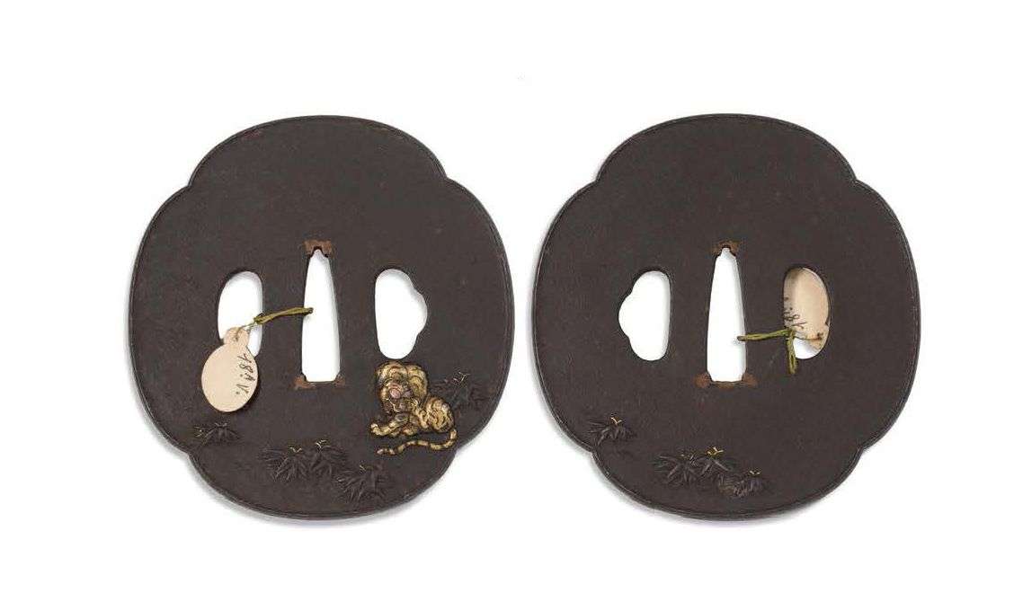 Nagamaru gata en fer à décor d'un tigre en cuivre doré sur des feuilles de bambou.