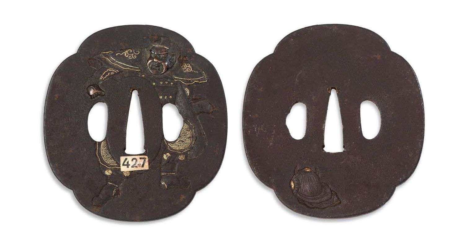 Nagamaru gata en fer à décor ciselé avec incrustations de shakudo d'un guerrier mongol. Trace de taka zogan de cuivre doré.