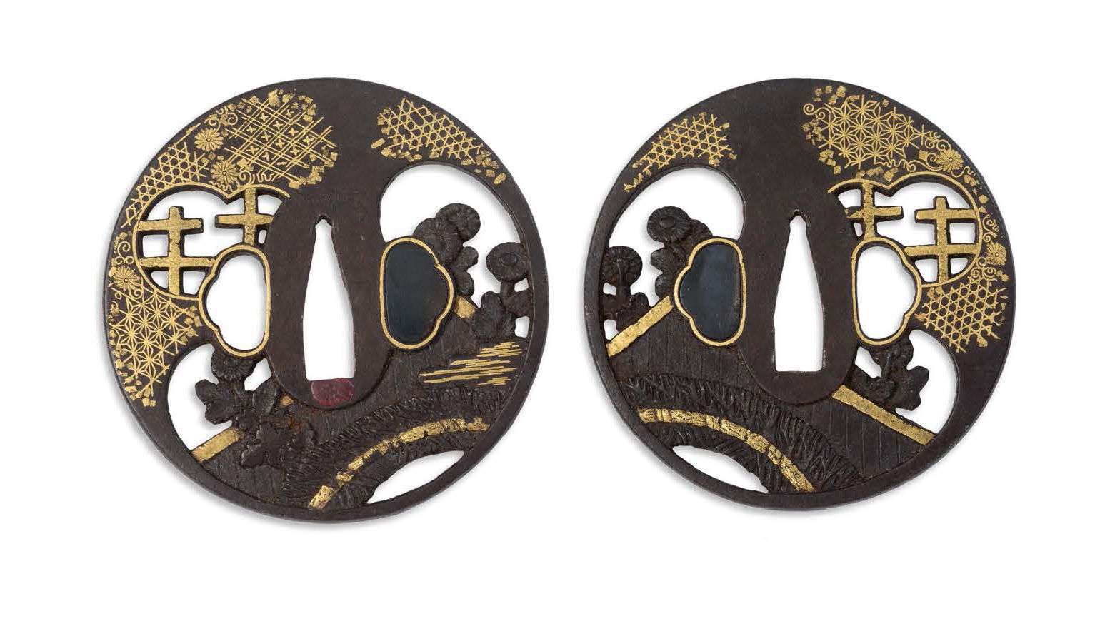 Nagamaru gata en fer ajouré incrusté de cuivre doré en taka zogan à décor d'un pont et de fleurs.