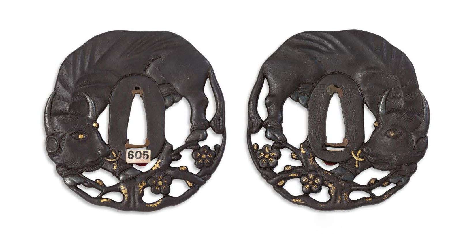 Nagamaru gata en fer à décor d'un boeuf et d'un cerisier en fleurs. Signé « Yoshu Matsuyama ju Shoami Moritsumi ».