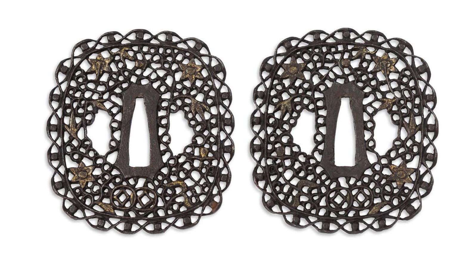 Nagamaru gata de style Namban en fer à décor ajouré en Maru Bori incrusté en taka zogan d'or, de rinceaux fleuris.