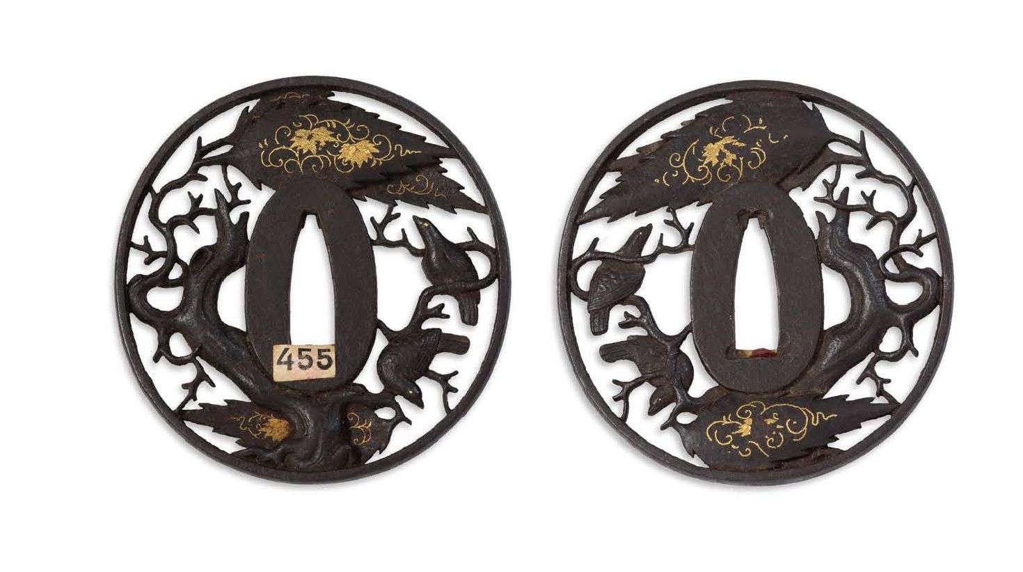 Nagamaru gata en fer à décor ajouré d'oiseaux sur un arbre, reste de taka zogan d'or sur les feuilles.