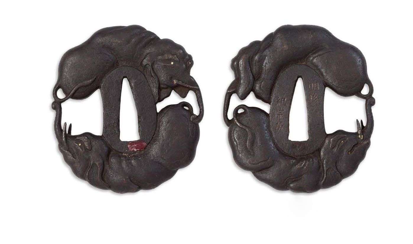 Nagamaru gata en fer à décor ajouré de deux éléphants. Signé « Myoshin ki Norifusa ».