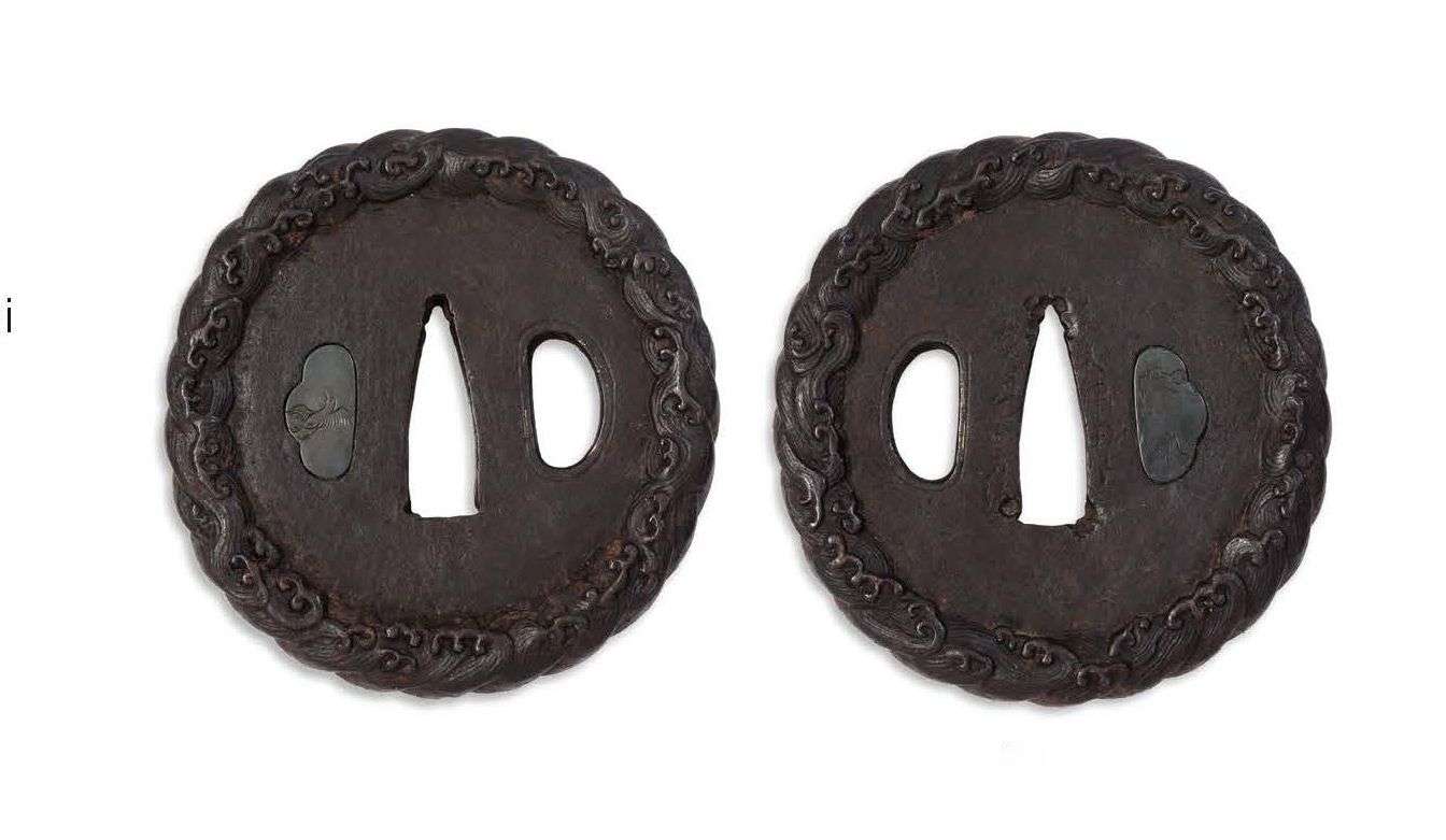 Nagamaru gata en fer à décor sur le mimi de vagues, le kogai bitsu est bouché avec du shakudo gravé d'oiseaux.