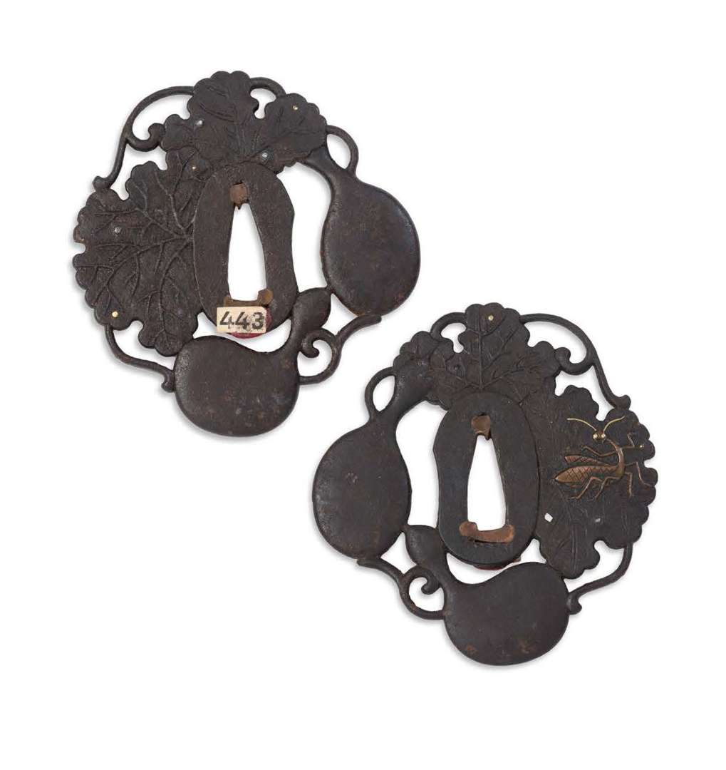 Tsuba en fer a décor de coloquintes et d'une mante religieuse en cuivre et taka zogan d'or sur une feuille.