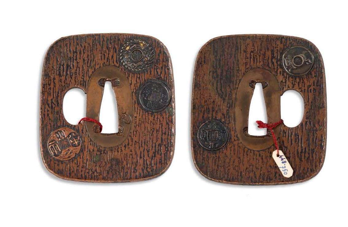 Hira kaku gata en cuivre figurant une planche de bois avec des pièces de monnaie posées dessus. Les pièces sont en argent, cuivre et shakudo. Signé «Kaô ».