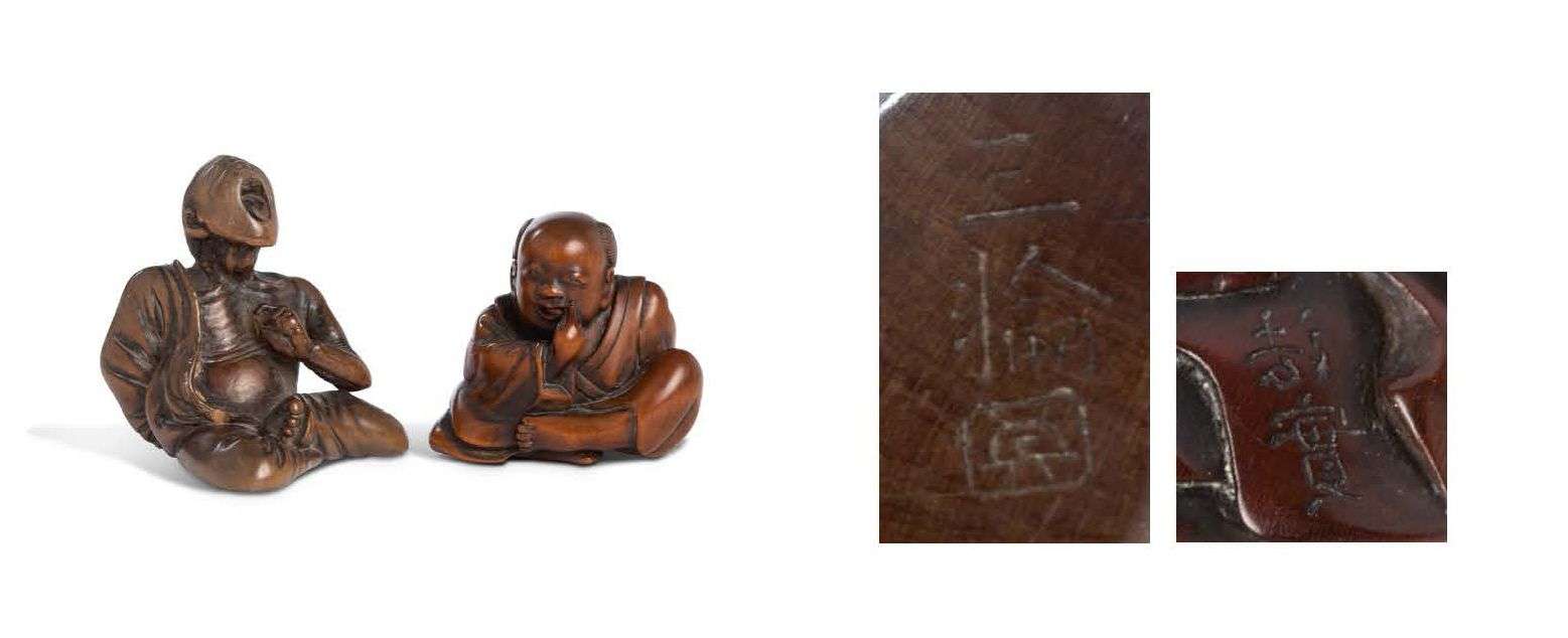 Deux netsuke en bois, l'un représentant un éternueur public assis, la bouche grande ouverte, signé Miwa | l'autre figurant un karako (enfant chinois) pointant son oeil droit de sa main gauche, la main droite vers l'arrière, montrant un masque d'Okame dans son dos, signé Hôjitsu.
