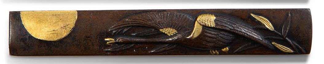 Kozuka en shakudo à décor ciselé et incruté d'or d'une oie en vol vers la lune.