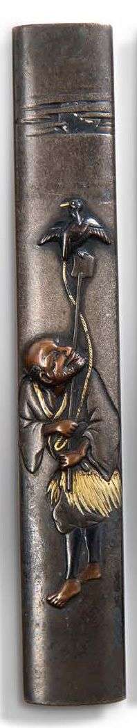 Kozuka en shibuichi à décor en cuivre et shakudo, d'un pêcheur et son cormoran.