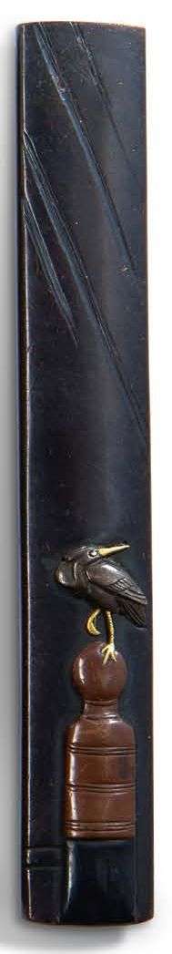 Kozuka en shakudo à décor en incrustations de cuivre, argent et d'or, d'une grue sur un poteau de pont.