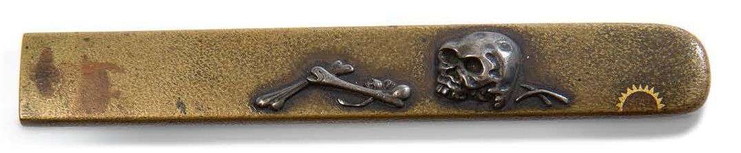 Kozuka en shibuichi à décor en argent d'une tête de mort et d'os.