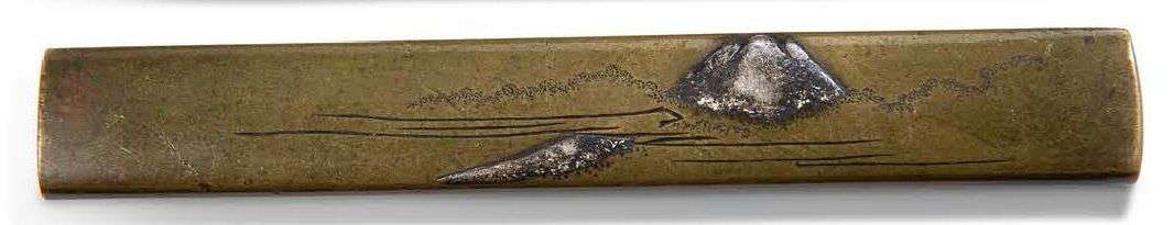 Kozuka en shibuichi à décor en argent représentant le Mont Fuji dans les nuages.