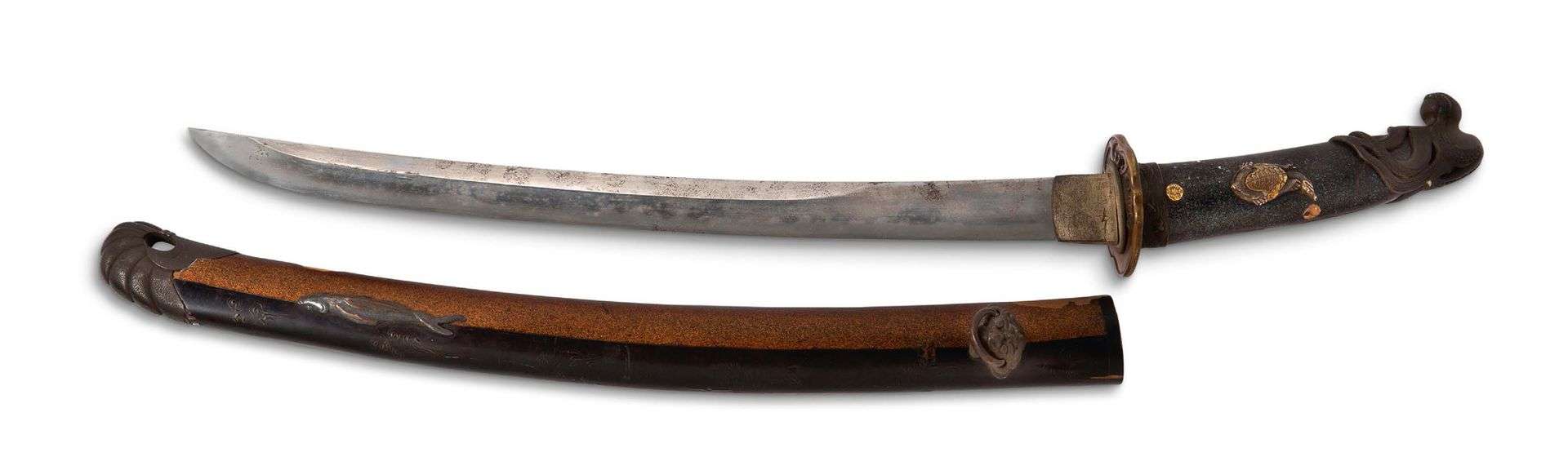Osafune ju Yokoyama Sukekane saku » et daté du 2e mois de la 3e année de Kaei (1850) | le koshirae avec éléments en suite,en shibuichi, (à l'exception de la tsuba), sur le thème des animaux marins, le fourreau laqué noir et nashiji, avec kojiri en forme de queue d'écrevisse, rehaussé d'un poisson, le fuchi orné de flots et pluviers, deux hanashimenuki figurant écrevisse et tortue minogame, appliqués sur la tsuka en nashiji vert dont l'extrémité est coiffée d'un poulpe | la tsuba en sentoku, ajourée de flots où volent des pluviers.