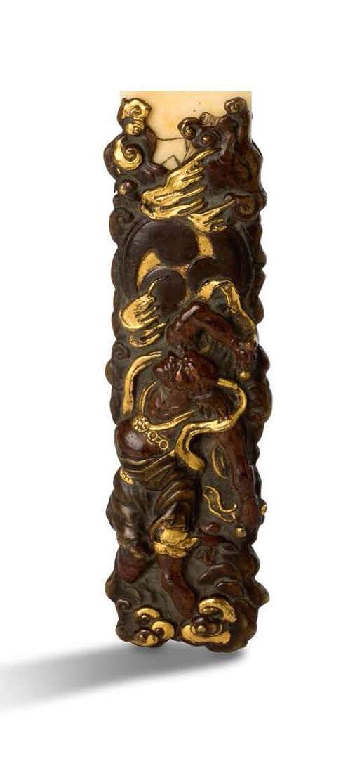 Manche de coupe-papier en sentoku repoussé et rehauts dorés, à décor représentant Raiden, dieu de l'orage, frappant dans un grand tambour, parmi flammes et éclairs. Signé.