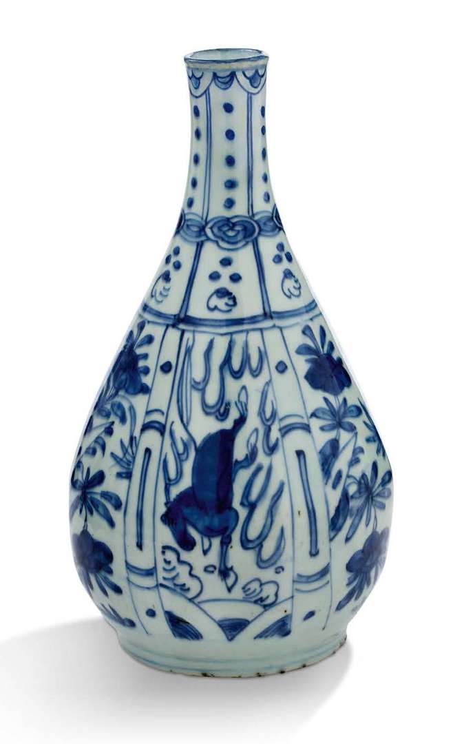 Vase bouteille en porcelaine bleu et blanc à long col à décor de chevaux parmi des fleurs et vagues stylisées.