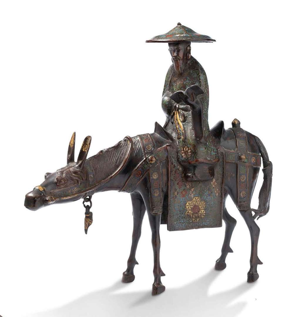 Groupe en bronze et émaux champlevés représentant Toba sur sa mule, coiffé d'un chapeau et tenant un livre ouvert.