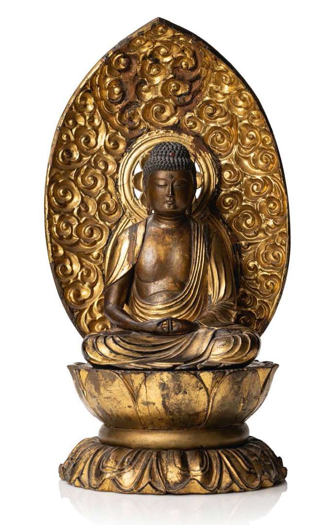 Sujet en bois laqué et doré, représentant le Bouddha Amida assis en méditation sur un socle lotiforme, adossé à une mandorle ornée de nuages stylisés.