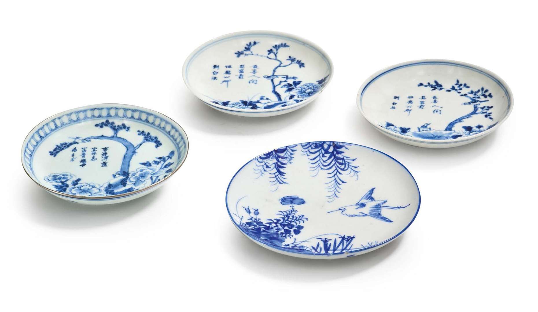 Trois coupes en porcelaine bleu-blanc de Huê, à décor de pivoines, pins de longévité et oiseaux. Marques Kangxi sur les bases.
