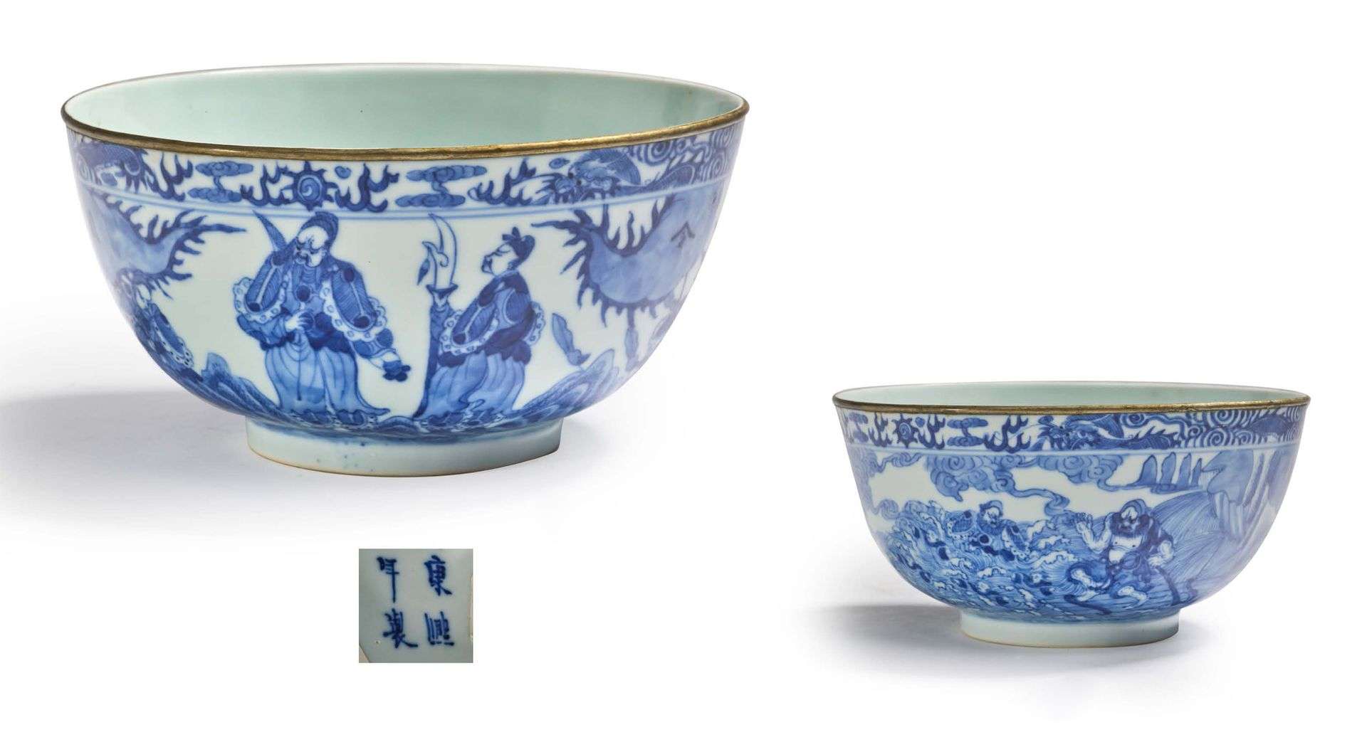 Royaumes, avec Guandi. Le bord souligné d'un dragon poursuivant la perle sacrée parmi des nuages. Marque Kangxi sur la base.