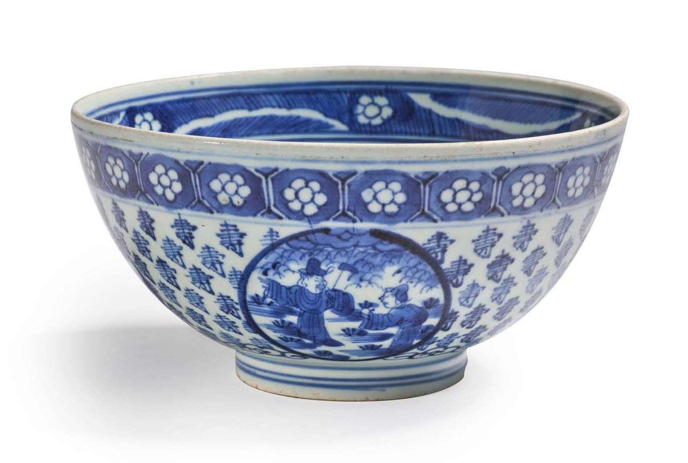 Coupe en porcelaine bleu-blanc de Huê, ornée de quatre médaillons à décor de scènes animées de personnages dont dignitaire et disciple, avec caractères shou et fleurs de prunus. L'intérieur à représentation de Zhoulao.