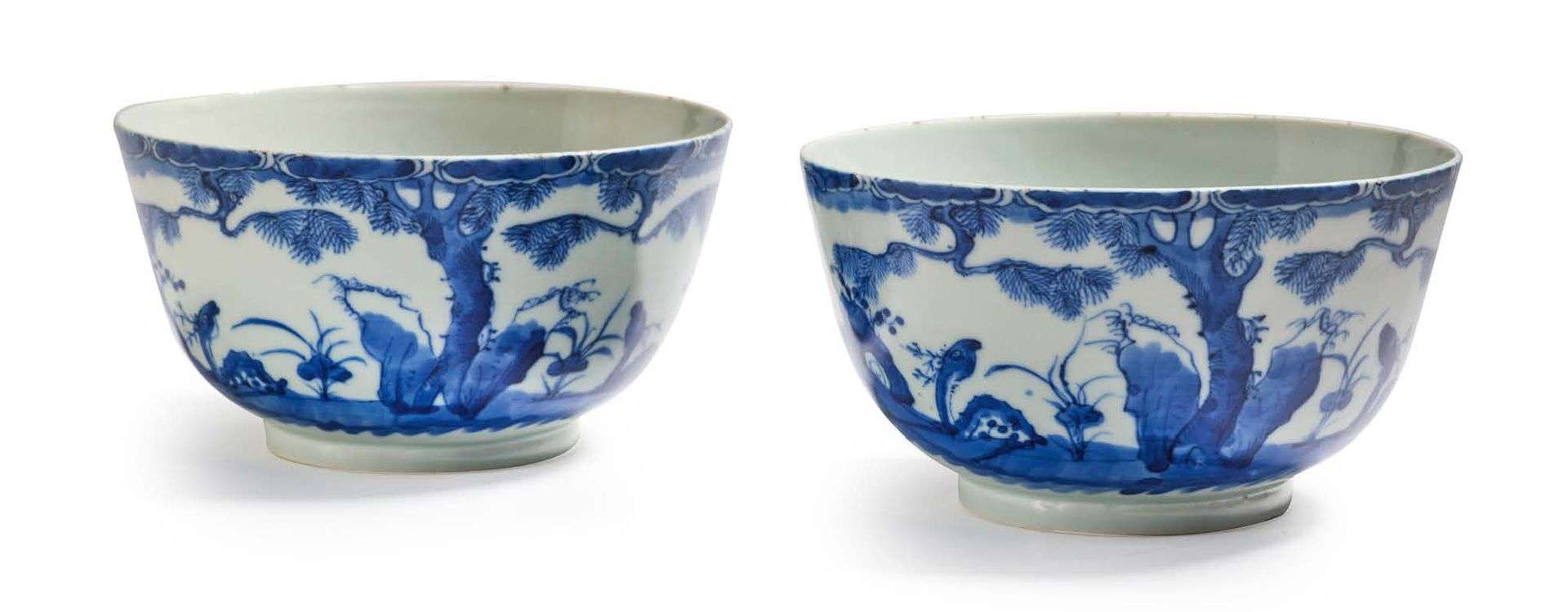 Paire de coupes en porcelaine bleu-blanc de Huê, à décor d'un couple de daims sous un pin de longévité parmi roches et lingzhi.