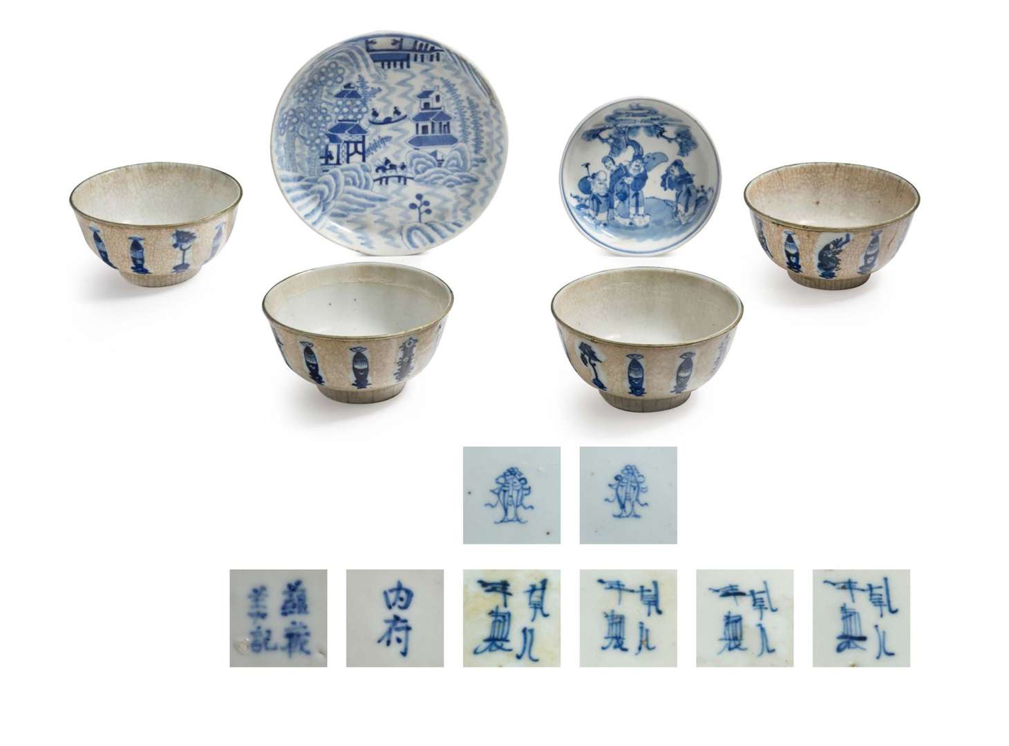 Ensemble comprenant deux coupes en porcelaine bleu-blanc dont l'une, figurant les trois divinités du Tao et un disciple devant un pin, marquée « Noi Phu », l'autre, figurant un village lacustre, marquée « Uan Tang My Ky » (Recording the Treasure of Beauty).
