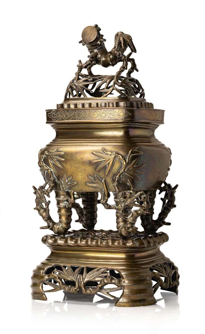 Brûle-parfum quadripode couvert en bronze de patine claire, à décor de bambous, les pieds et la prise du couvercle en forme de tige de bambou avec feuille, sur un socle en forme de feuilles de bambous.