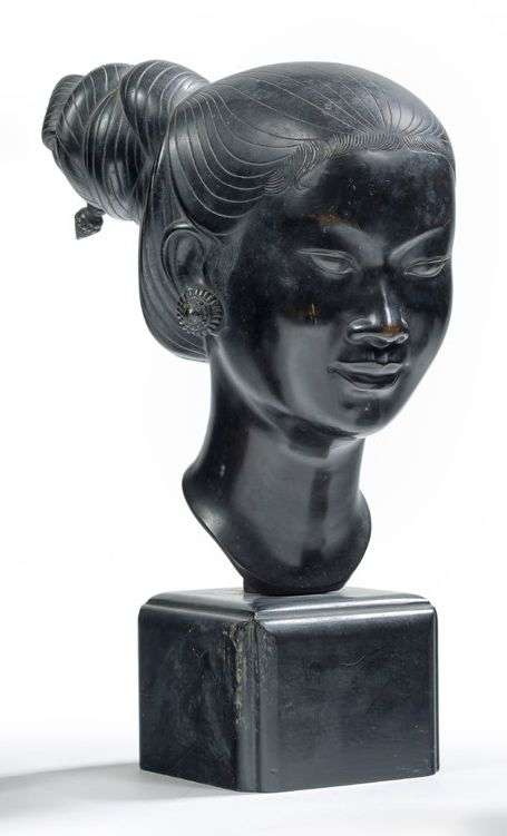 Tête de jeune femme en bronze sur socle, aux cheveux relevés en chignon.