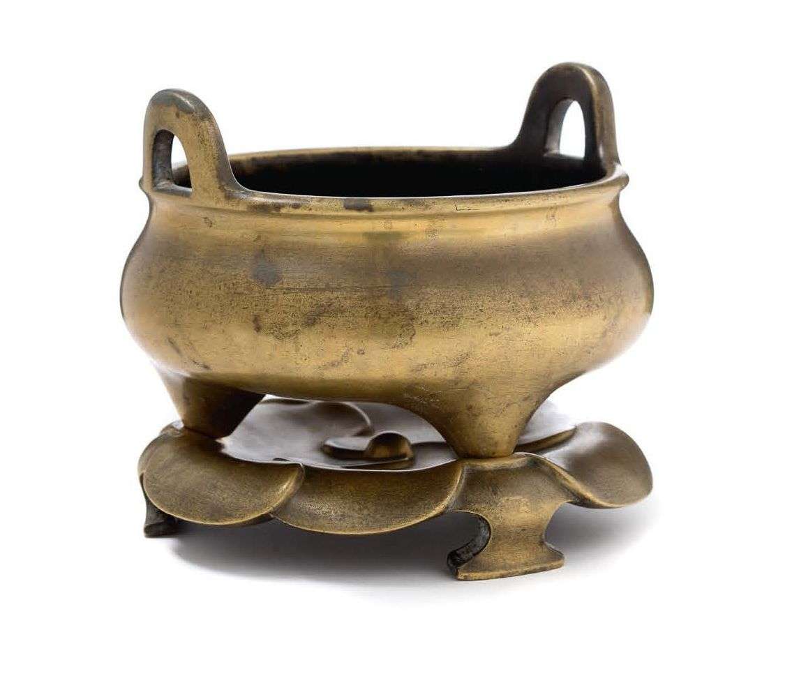 Brûle-parfum tripode en bronze doré sur son socle en forme de lotus.