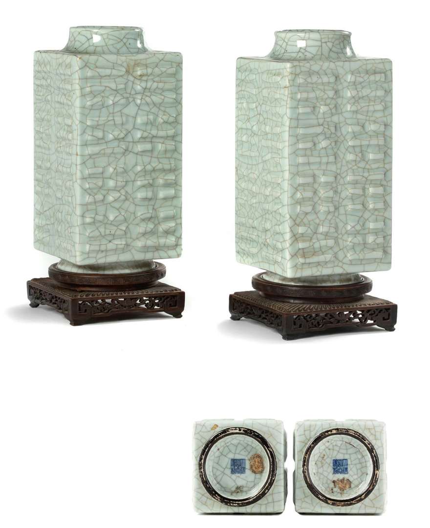 Paire de vases Cong en porcelaine et émail céladon craquelé de type Ge, à décor des trigrammes du Tao (Ba gua).