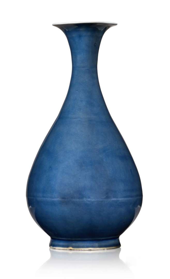 Vase bouteille à long col et large ouverture, en porcelaine émaillée bleu.